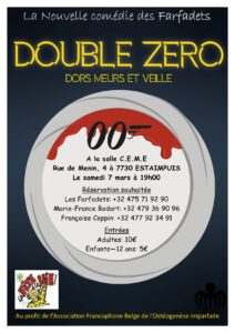 Les Farfadets remontent sur scène pour vous présenter leur pièce « DOUBLE ZÉRO – Dors, meurs et veille« , et ils vous attendent nombreux pour faire de cette représentation un véritable élan de solidarité. Plus qu’un spectacle festif, cette soirée a une mission essentielle : soutenir La Fête à La Vie, engagée dans la recherche médicale contre la maladie des os de verre.